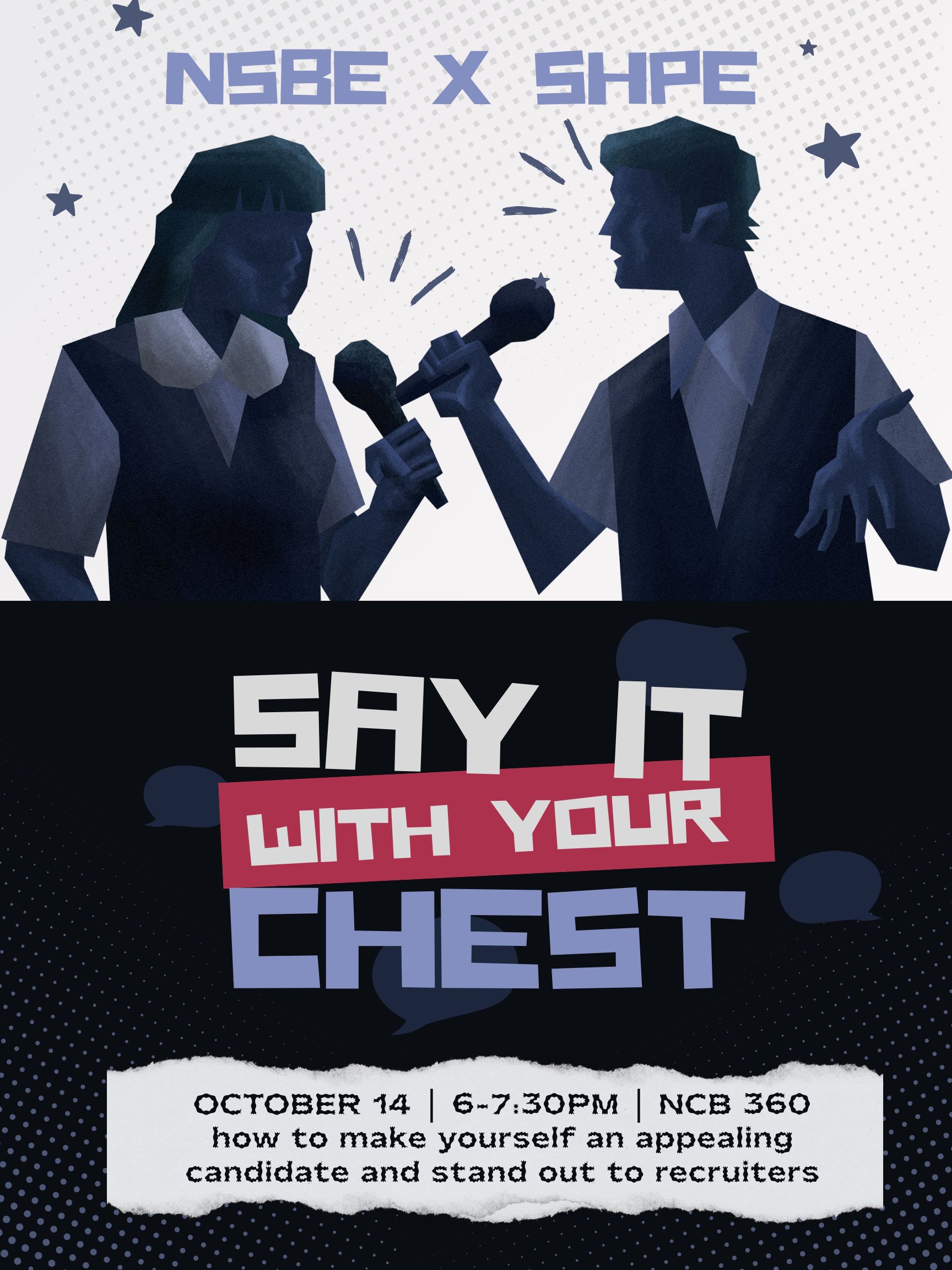 Join NSBE x SHPE for an interactive workshop on crafting the perfect elevator pitch! Learn how to speak to recruiters with confidence and leave a lasting impression.