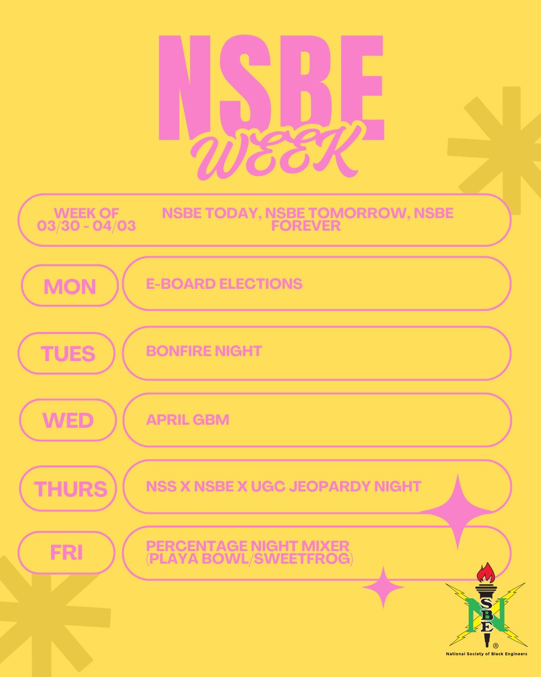 If you have any questions at all please send me an email or reach out to me directly on GroupMe! Hope to see you all at E-Board elections on Monday along with the rest of the NSBE week events!
