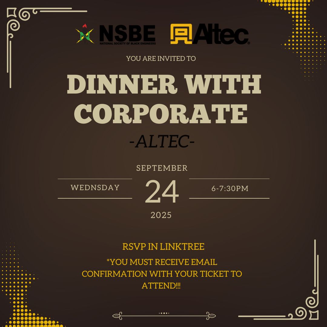 Join us for an exclusive evening with Altec representatives! This is a fantastic opportunity to network directly with recruiters, connect with NSBE members in your major, and learn more about the company. Altec hires across majors like ME, ECE, ISE, Computer Engineering, and more, so don’t miss your chance to make valuable connections.