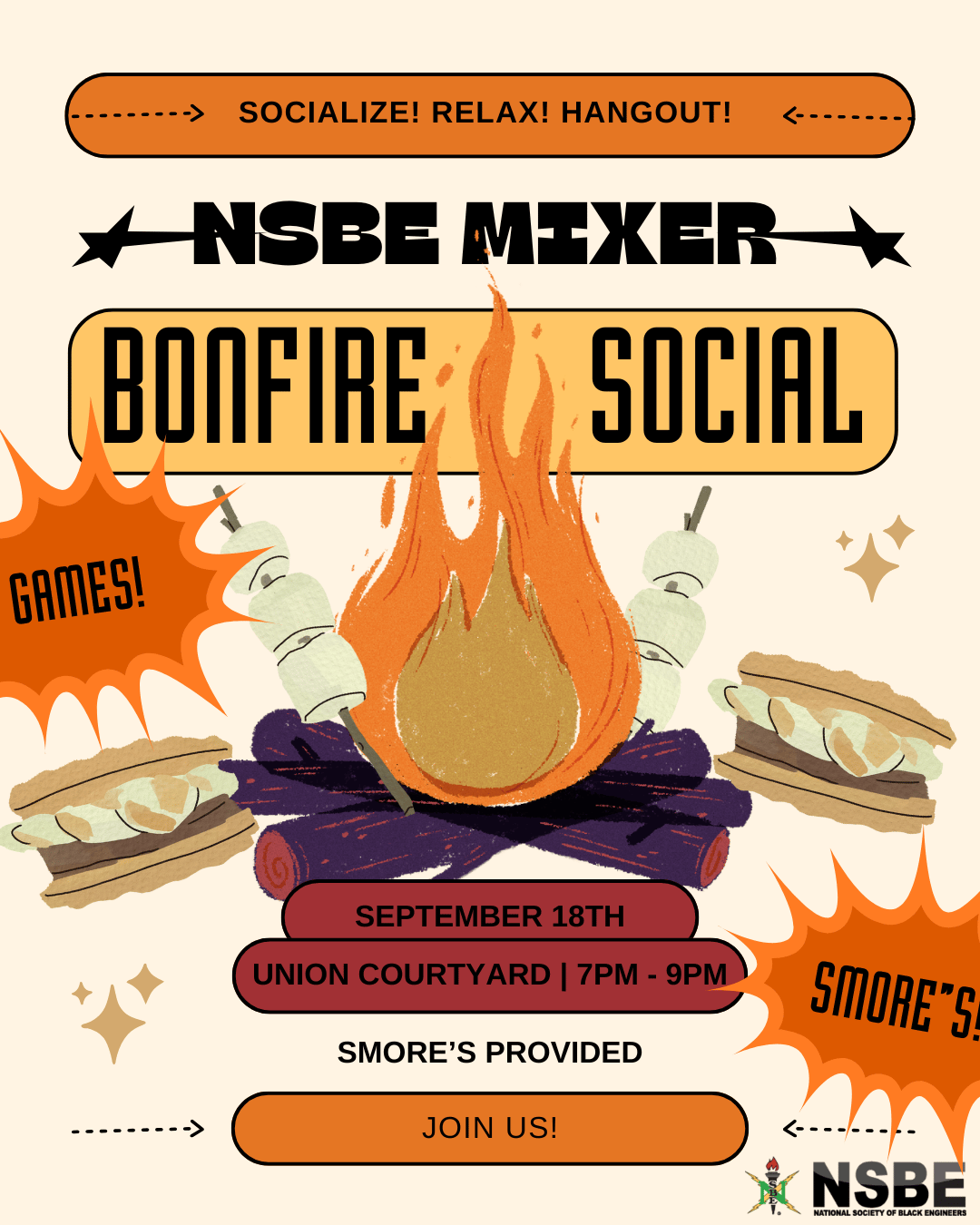 Join us this Thursday at the Union for a fun evening around the bonfire! Come out for free s’mores, games, and a chance to connect with your fellow NSBE members.