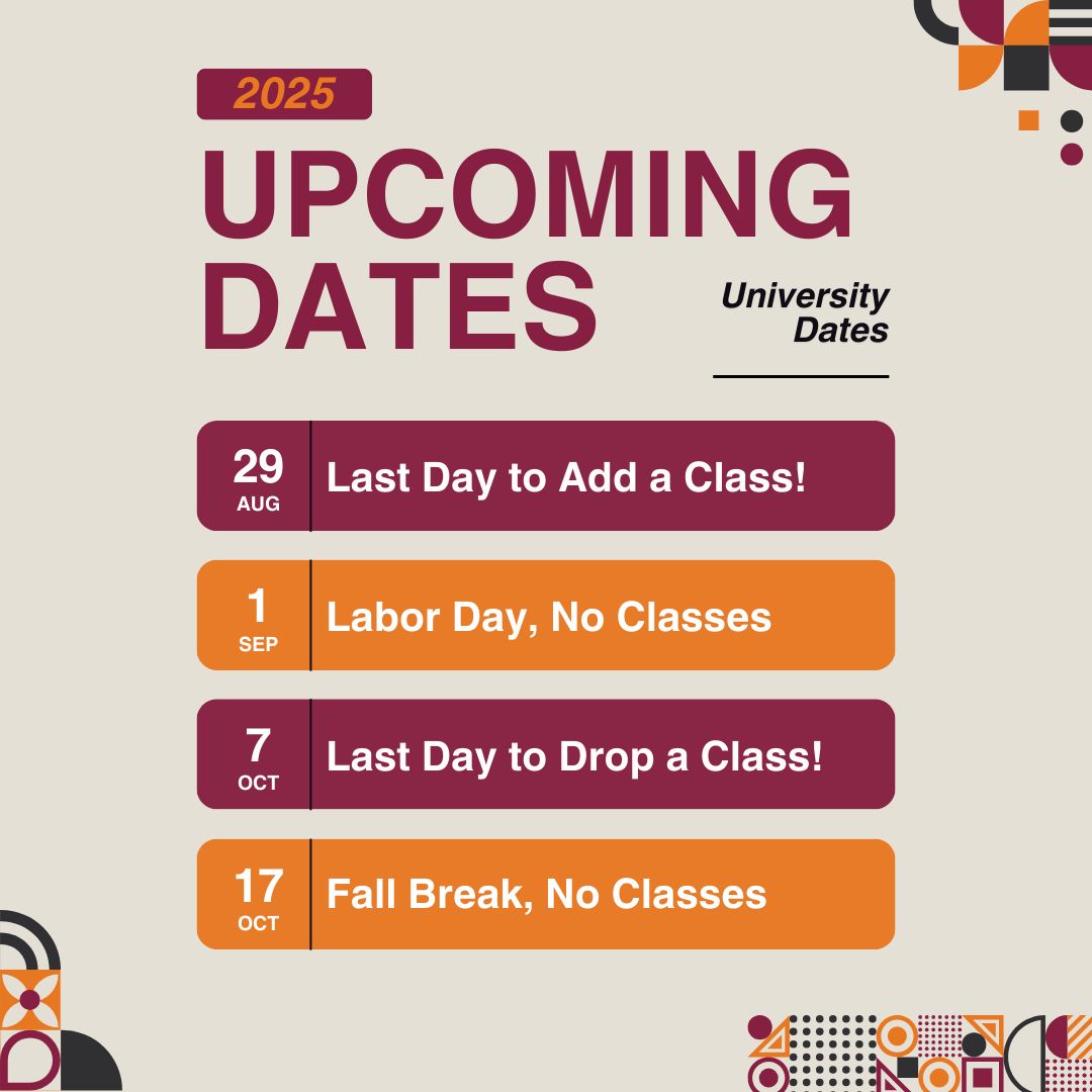 FALL UNIVERSITY DATES![]() Mark your calendars! Dropping a class by Oct. 7th does not use a W. | RESEARCH SEMINAR![]() In-person seminar style class run by Dr. Waller in Surge 104C! Make sure to sign up by Aug. 29th in order to learn more about undergraduate research opportunities on campus. |