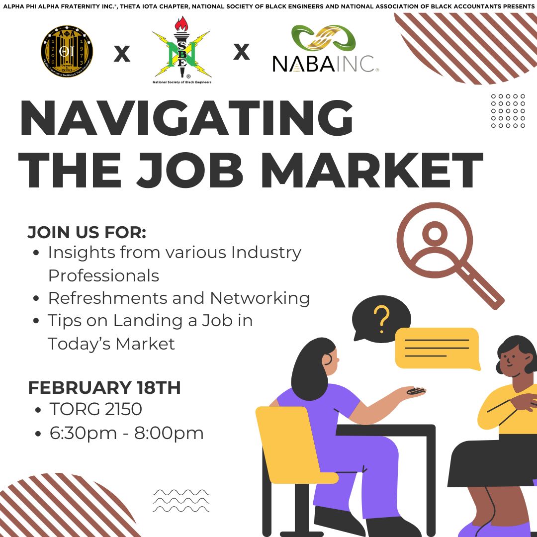 - Navigating the Job Landscape – Gain career advice from industry professionals on Feb 18, 6:30-8 PM in TORG 2150 with NSBE, NABA, and Alpha Phi Alpha.