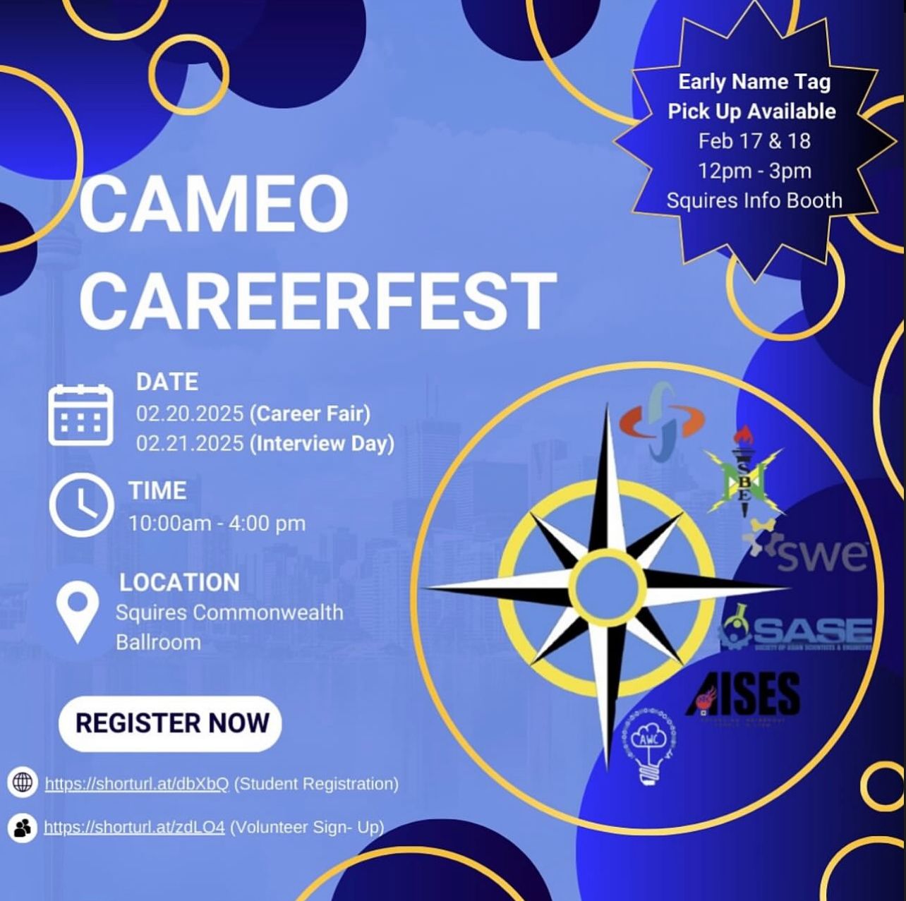 - CAMEO Career Fair – Connect with recruiters on Feb 20, 10 AM - 4 PM in Squires Ballroom. Interview Day follows on Feb 21. Early name tag pickup: Feb 17 & 18, 12-3 PM at Squires Info Booth.