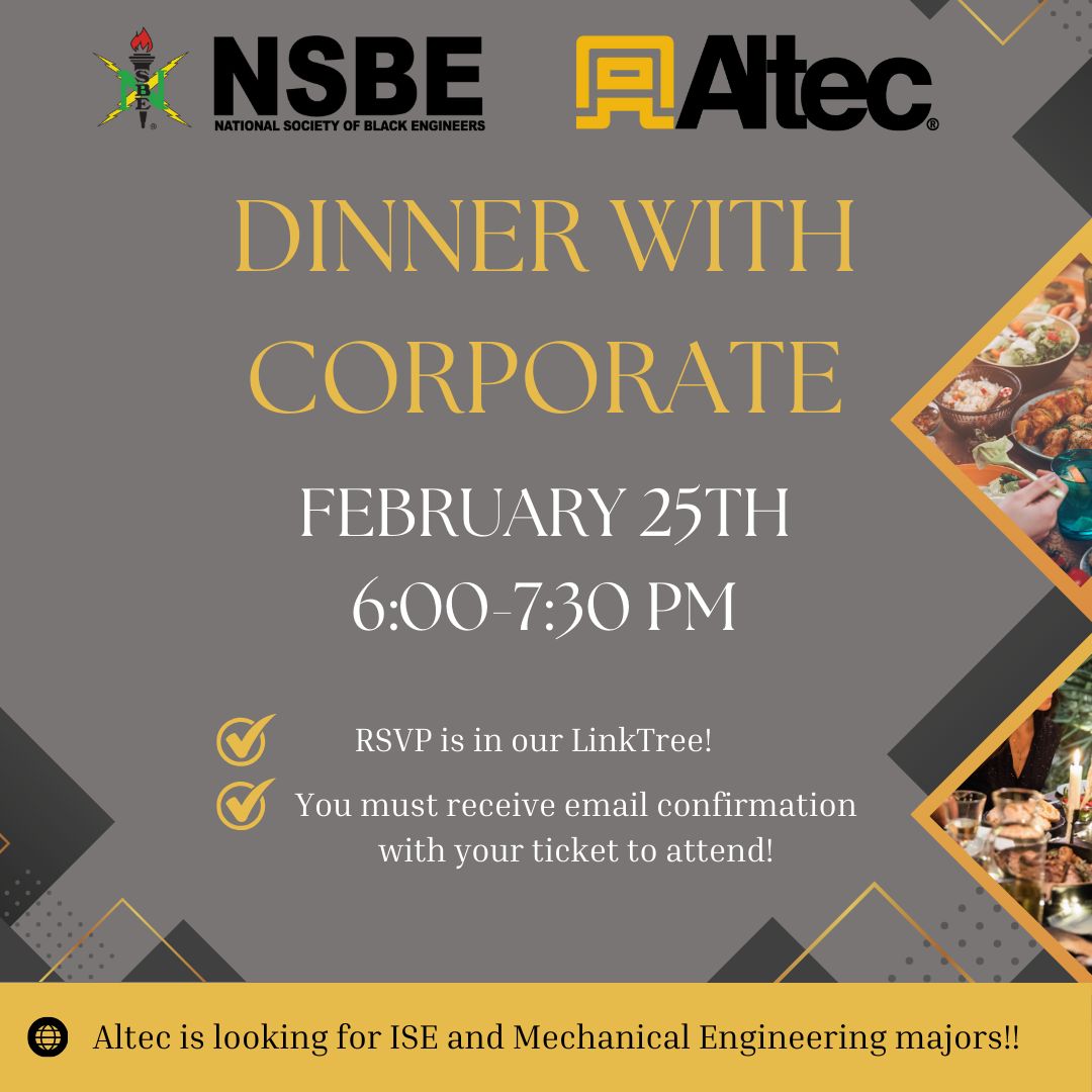Join us for our February corporate dinner with Altec on February 25th from 6:00-7:30 PM! This is a great opportunity to connect with Altec representatives and your fellow NSBEsties over dinner. Altec is specifically looking for ISE and Mechanical Engineering majors, so don’t miss out! There are only 20 spots available, and you must RSVP through our LinkTree by February 19th at 11:59 PM to secure your seat. Business casual attire is required. We hope to see you there!